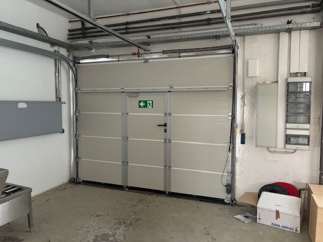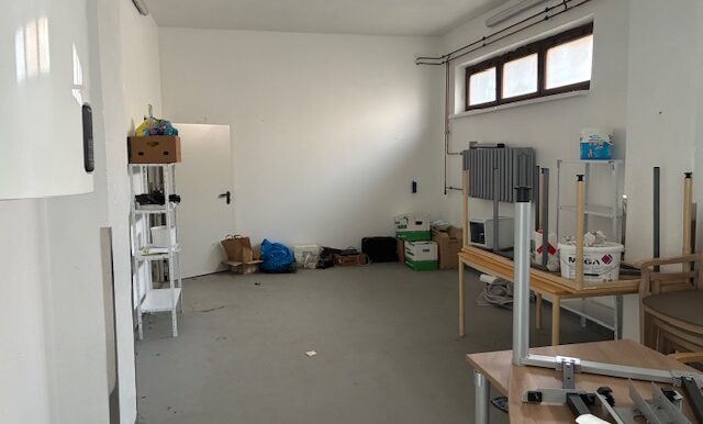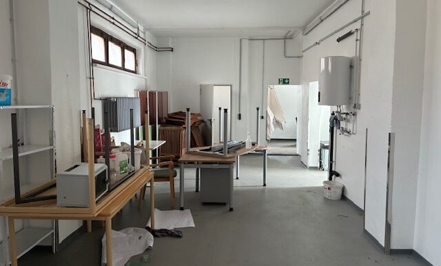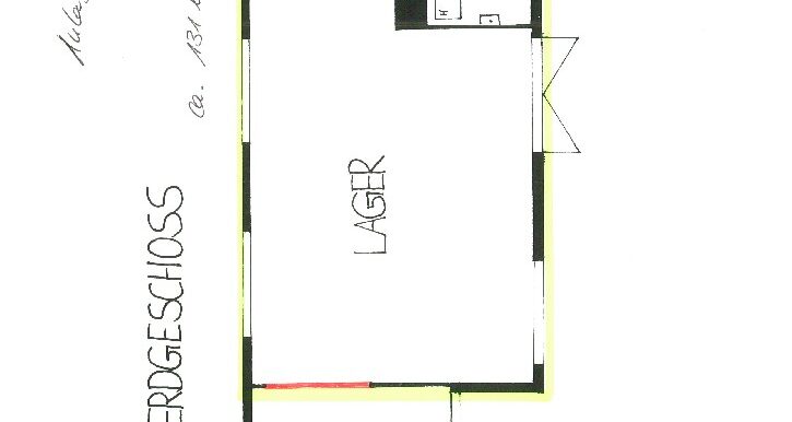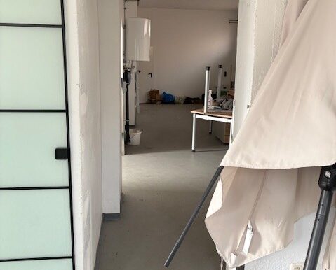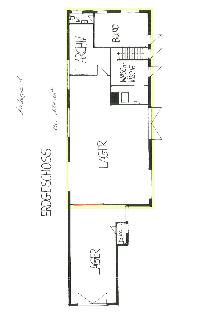 Im Erdgeschoss befindet sich ein Büro mit WC und separatem Eingang, eine ehemalige Waschküche, ein 112 m² goßes, beheizbares Lager mit Rolltor und ein Archiv. Gesamtfläche ca. 131 m².