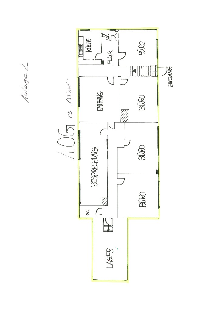 Das Obergeschoss besteht aus 6 Räumen, einer Küche mit EBK, einem WC und einem Lager/Archiv mit einer Gesamtfläche von ca. 155 m². Der Zugang erfolgt über einen separaten Eingang. Insgesamt stehen ca. 8 Stellplätze zur Verfügung, die über einen separaten Stellplatzmietvertrag ( je Stellplatz 40,- EUR) angemietet werden können.