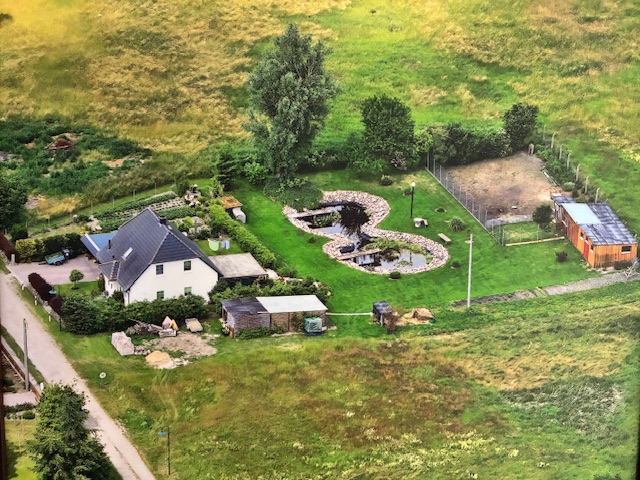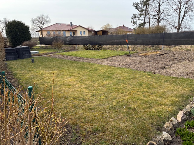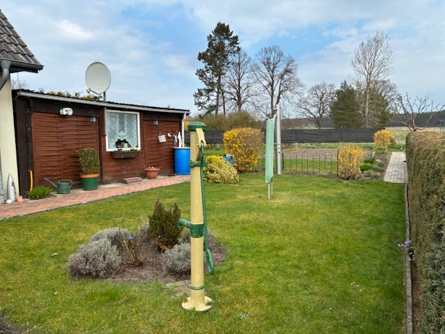 Das Grundstück ist bepflanzt mit diversen Blumen, Himbeer-, Johannes- und Stachelbeersträuchern, sowie einem Birnenbaum, einer Süßkirsche und zwei Apfelbäumen. Ansonsten ist das Grundstück überwiegend mit Rasen bepflanzt, besitzt einen Vorgarten, einen Wäscheplatz und einen Gemüsegarten.