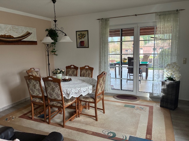 Das Haus betritt man über die Eingangsdiele und kommt von dort geradeaus durch eine doppelflüglige Tür in das Wohnzimmer. Linkerhand, vor dem Wohnzimmerzutritt befindet sich das Gäste-WC und in der Hauswirtschaftsraum, der auch einen Ausgang zum Carport hat, um Einkäufe unkompliziert ins Haus zu bekommen. Rechterhand gelangt man in die Küche und von dort in das hofseitige Esszimmer mit Kamin und Austritt auf die überdachte Terrasse in Ostausrichtung.