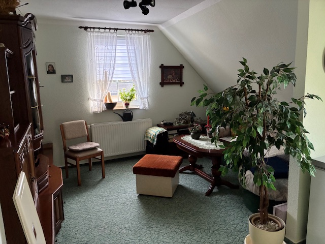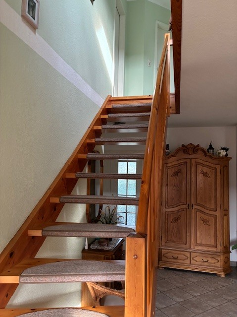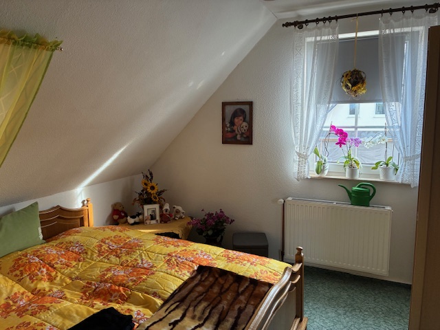 Des Weiteren gelangt man über eine Holztreppe in das Obergeschoss mit zwei Schlafzimmern, einem Bad mit Eckwanne und Dusche. Ein mögliches drittes Zimmer im Dachgeschoss ist zum Flur geöffnet und dient als offene Leseecke. Dieser Bereich kann selbstverständlich wieder geschlossen werden und dann als Zimmer genutzt werden. Die Diele und die Küche im Erdgeschoss besitzen eine elektrische Fussbodenheizung. Das Bad im Dachgeschoss hat eine Fussbodenerwärmung über den Heizwasserrücklauf.