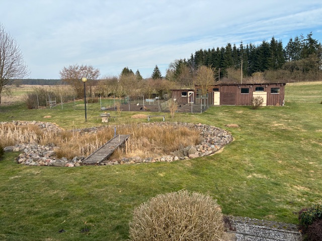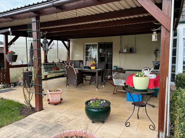 Im Außenbereich befindet sich links neben dem Haus ein Carport mit sich anschließender Werkstatt und rechts neben dem Haus ein langgezogener einfacher Schuppen als Unterstell- und Lagermöglichkeit. Das Grundstück fällt nach hinten leicht ab und besitzt dort einen kleinen Teich, der derzeit kein Wasser führt. Weiter befindet sich auf dem hinteren Grundstück ein eingezäunter Bereich mit Schuppen für die bestehende Geflügelhaltung.