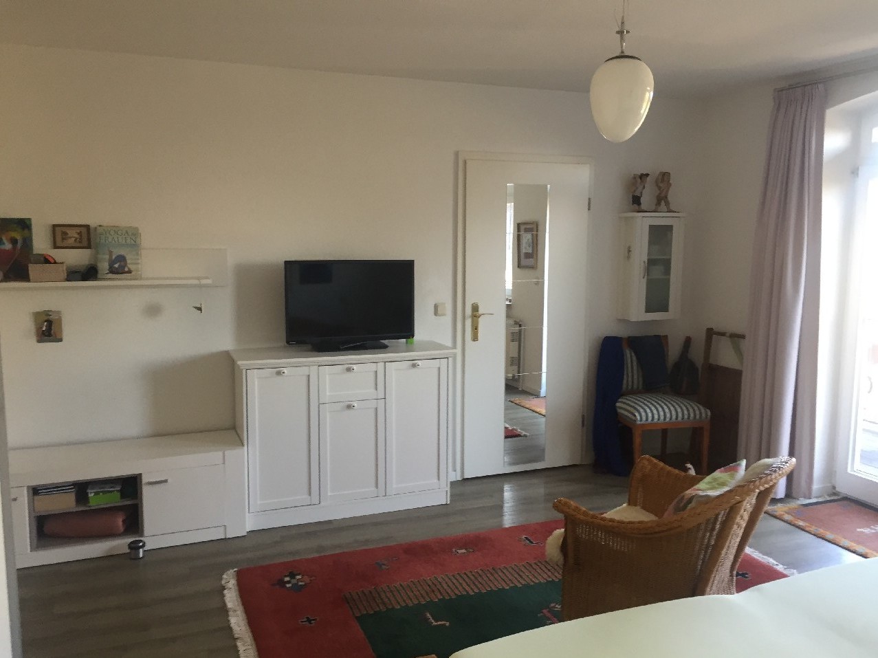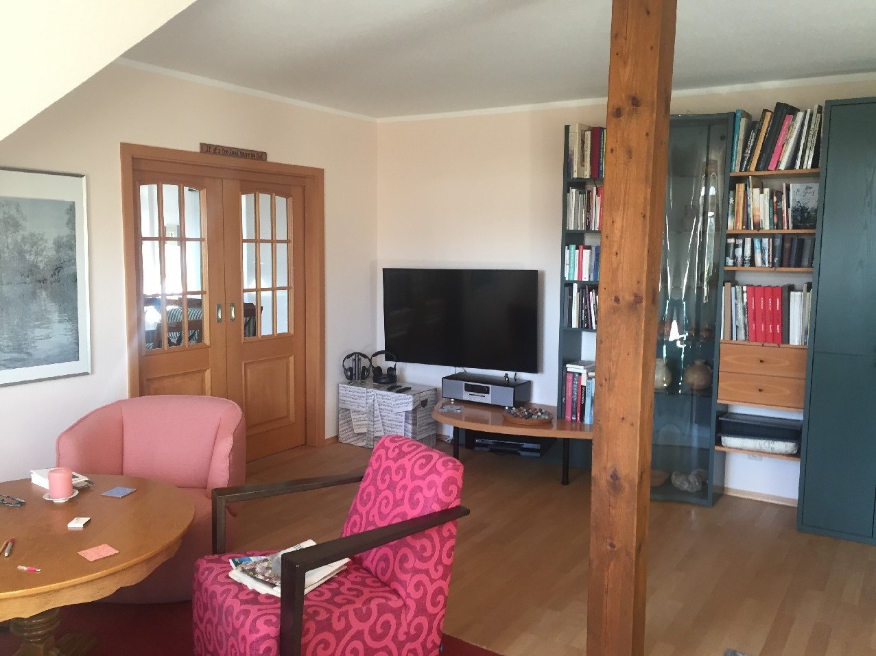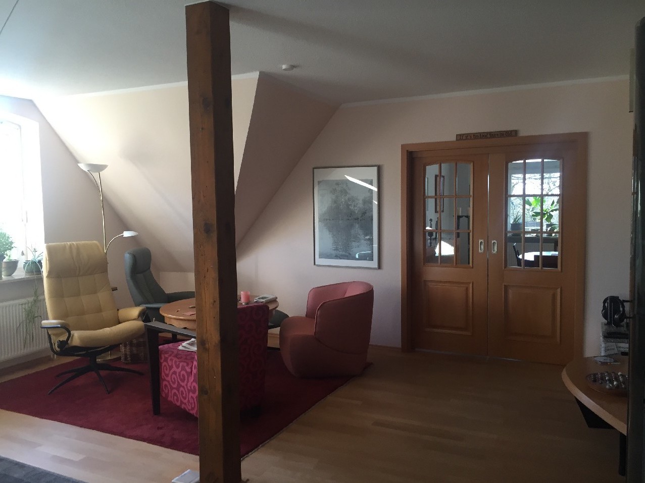 Die zu vermietende Wohnung befindet sich im Obergeschoss eines Zweifamilienhauses. Diese begeht man durch einen separaten Eingang. Hier führt eine Steintreppe ins Dachgeschoss. Vor der Wohnungstür befindet sich ausreichend Platz für eine Garderobe und zum Abstellen der Schuhe. Sie teilt sich auf in einen geräumigen Flur, eine kleine Küche mit Einbauküche und Schiebetür, ein Wohnzimmer, ein Esszimmer mit Zugang zum Balkon und offen zum Flur, ein Schlafzimmer mit Balkon und Duschbad (Waschmaschinenanschluss, Fenster), ein kleines Vollbad mit Fenster und Dachschräge sowie einen kleinem Abstellraum.