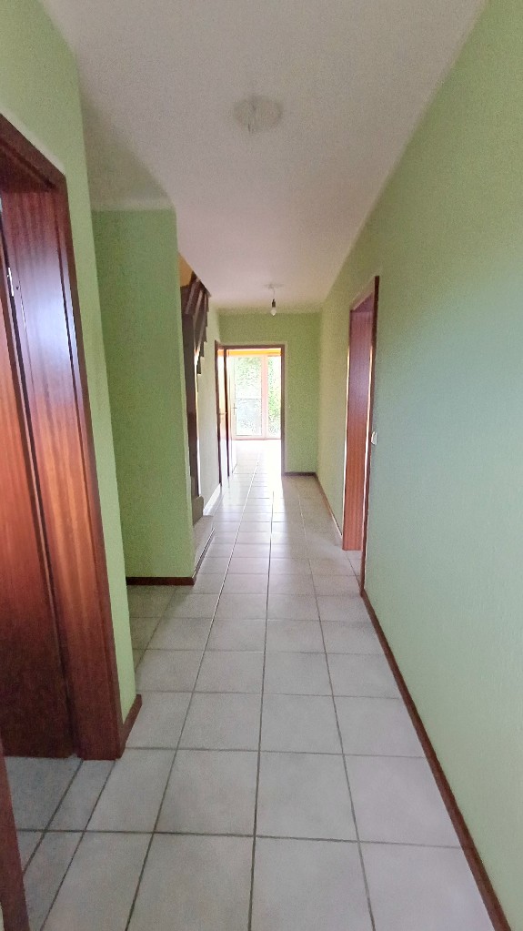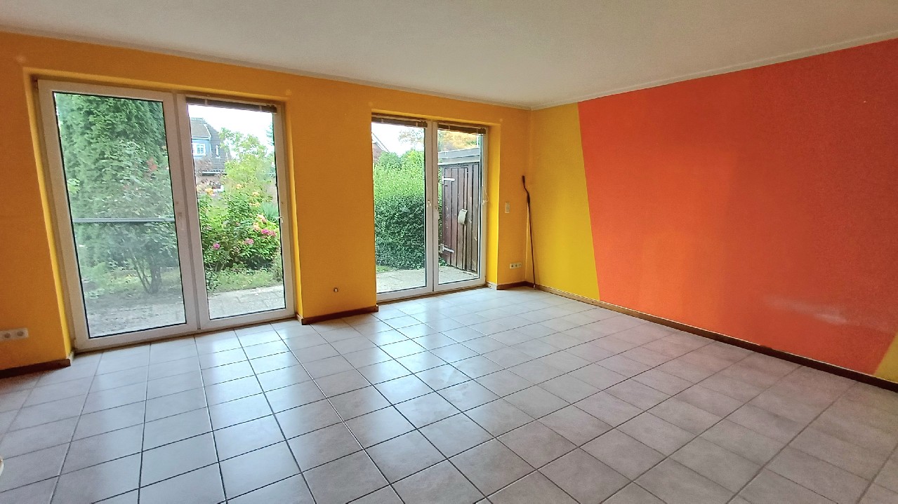 Über den Eingangsflur gelangt man linkerhand in das Gäste- WC. Rechts kommt man in die Küche und einem dahinterliegenden Hauswirtschaftsraum in dem sich der Waschmaschinenanschluss befindet. Geradezu gelangt man in das geräumige Wohnzimmer mit Austritt auf die Terrasse. Das gesamte Erdgeschoss ist gefliest und im Wohnzimmer befindet sich eine Fußbodenheizung.