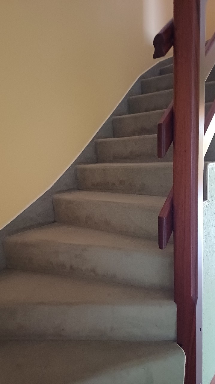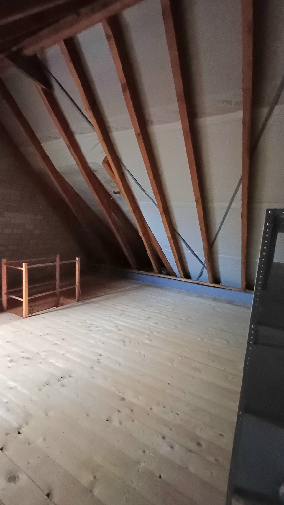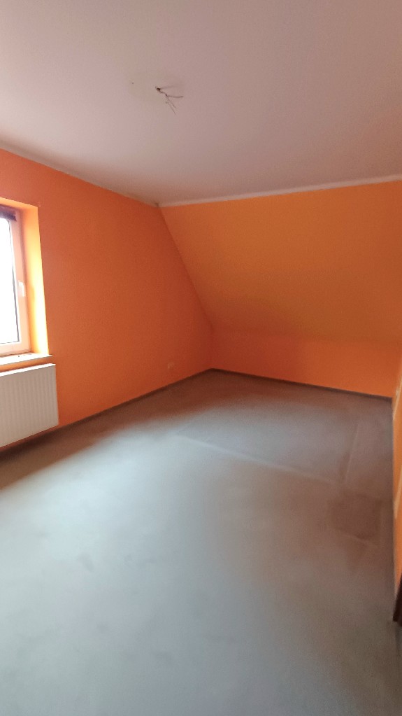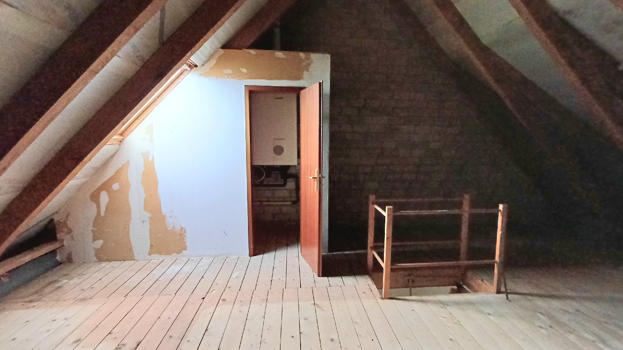 Über die massive Treppe erreicht man das mit Auslegeware versehene Obergeschoss. Hier befinden sich drei Schlafzimmer und das Vollbad mit Wanne und Dusche. In dem Bad befindet sich eine Fußbodenheizung. Über eine Einschubtreppe geht man auf den Dachboden.