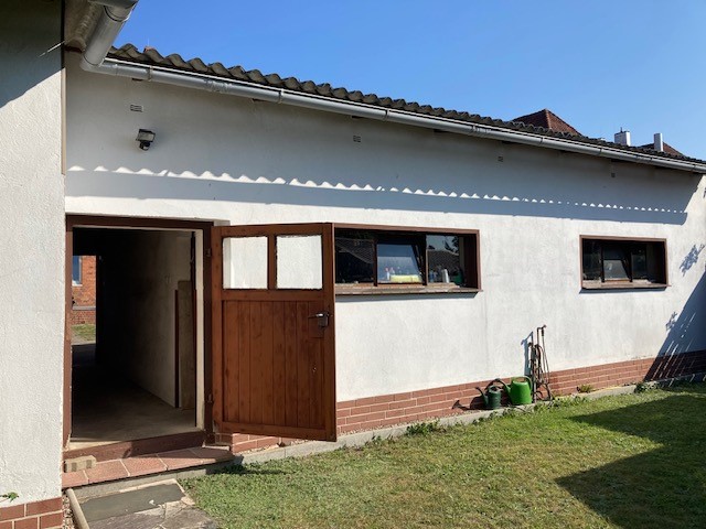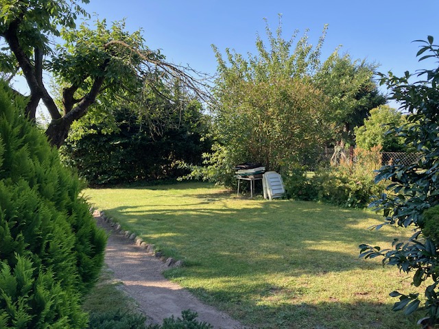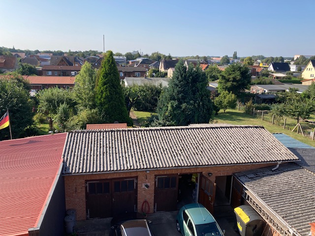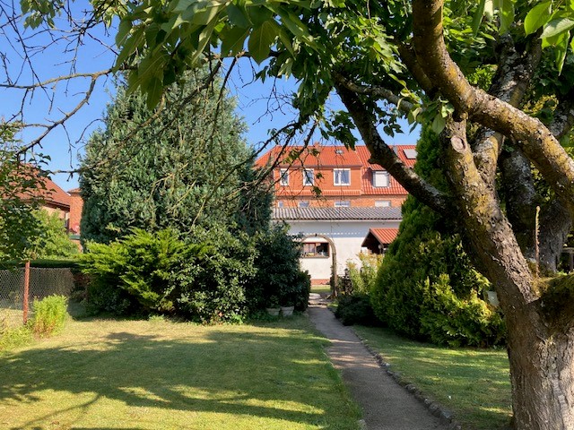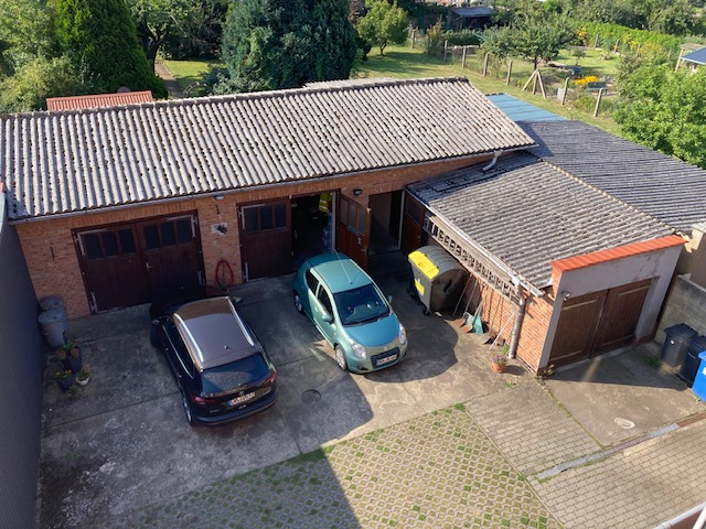 Über eine Hofzufahrt rechts des Hauses, gelangt man auf den Hinterhof. Dieser ist vor 2 von 3 Garagen betoniert, ansonsten gepflastert bzw. mit Rasengittersteinen versehen. Hinter den Garagen erstreckt sich ein mit Rasen versehener, grüner Grundstücksbereich in Südausrichtung. Am Ende des zum Hause gehörenden Grundstücks, befindet sich eine kleine städtische Grundstücksfläche, welche mit genutzt und gepflegt wird.