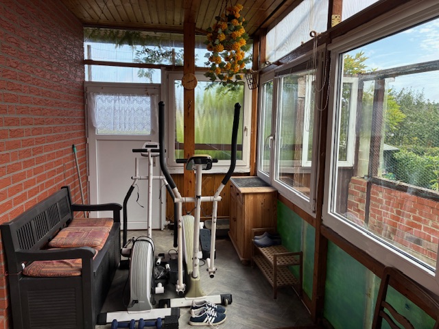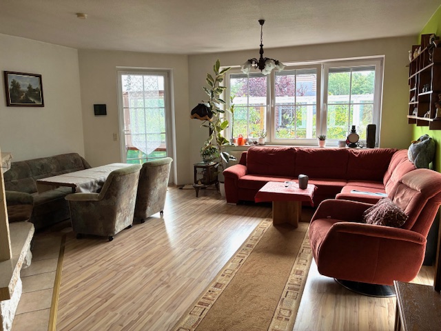 Das Haus teilt sich wie folgt auf: die Küche mit Einbauküche, Hauswirtschaftsraum mit Nebenausgang, Schlafzimmer, Vollbad mit Wanne und Dusche, Wohnzimmer mit Kamin und Ausgang auf die Terrasse mit einem, in Eigenregie angelegten Wintergarten, ein zweites Zimmer, ebenfalls mit Zugang zur Terrasse, Gäste- WC und ein drittes Zimmer, ca. 125,46 m² Wfl.