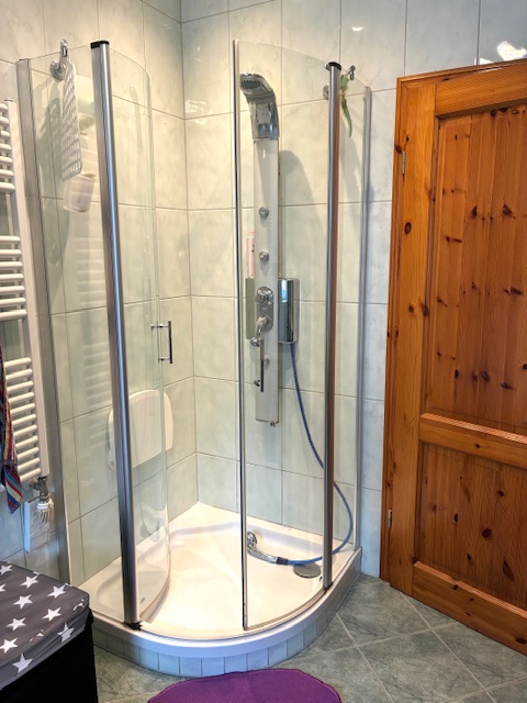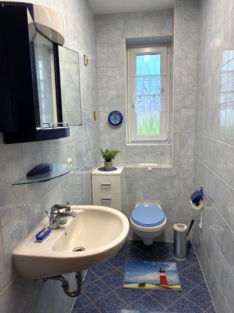 - Badausstattung: Dusche, Badewanne, Fenster im Badezimmer